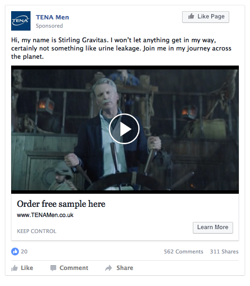 Create and launch several campaigns centered around the character Stirling Gravitas to promote TENA Men’s products, tackling the stigma around incontinence while encouraging men to take control with confidence.